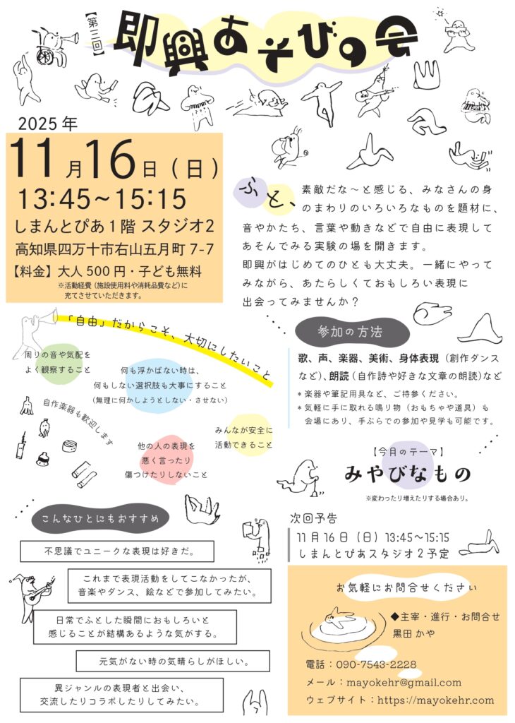 【出没のおしらせ】 2025/10/26(日)10:00から日没ごろ📍四万十川 入田キャンプ場すばらしき音楽催事、川じゃんロックフェスティバルにて「黒田ブース」なるもので出没予定です。「黒田ブース」は、メインステージとちょっと離れたところに位置し、ちいさめの鳴り物や音の鳴るおもちゃが自由に触ってあそべます。本編の演奏に反応したり、音楽にふさわしい音&踊りを開発したり、フェスの様子をスケッチしたり、みなさんの思いつきを妖怪になった黒田がゆるく応援する自由なブースです。離れている時間もあるかと思われますが、会場のどこかには終日いるはず。ステージには素敵なミュージシャンたちたくさん出演しますよお近くの方はぜひお立ち寄りください ▼2025/11/16(日)【 即興あそびの会】即興的に、音楽や踊りや芝居や言葉が実験できる場をやりたく、開催します第三回目のお題は、みやびなものにしてみました。気軽にさくっと来てもらえたらうれしいです。 高校時代の旧友・クラリネット奏者の福島氏と一緒に、野村誠さん作曲のピアノエテュード《春日の50の物語》を演奏してあそびました。元々ピアノのための曲を分け合って演奏するのは高校時代もやっていましたが、今回とても久しぶりで、わくわくする楽しい体験でした。わたしたちの、のどかでちょっと不思議なアンサンブルをお楽しみいただけたらさいわいです。